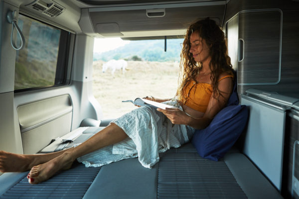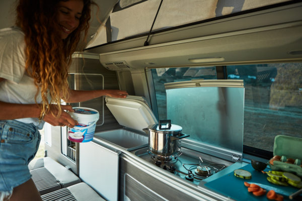 Le van Volkswagen T6 Ocean de VanBreak est super bien équipé. A l’intérieur, il y a une cuisine, avec de la vaisselle, des plaques pour cuisiner, un frigo, 2 lits de deux places aménageables, des prisesélectriques partout et des lumières.