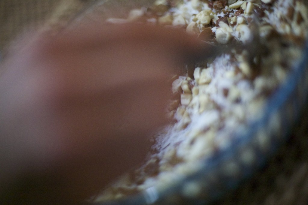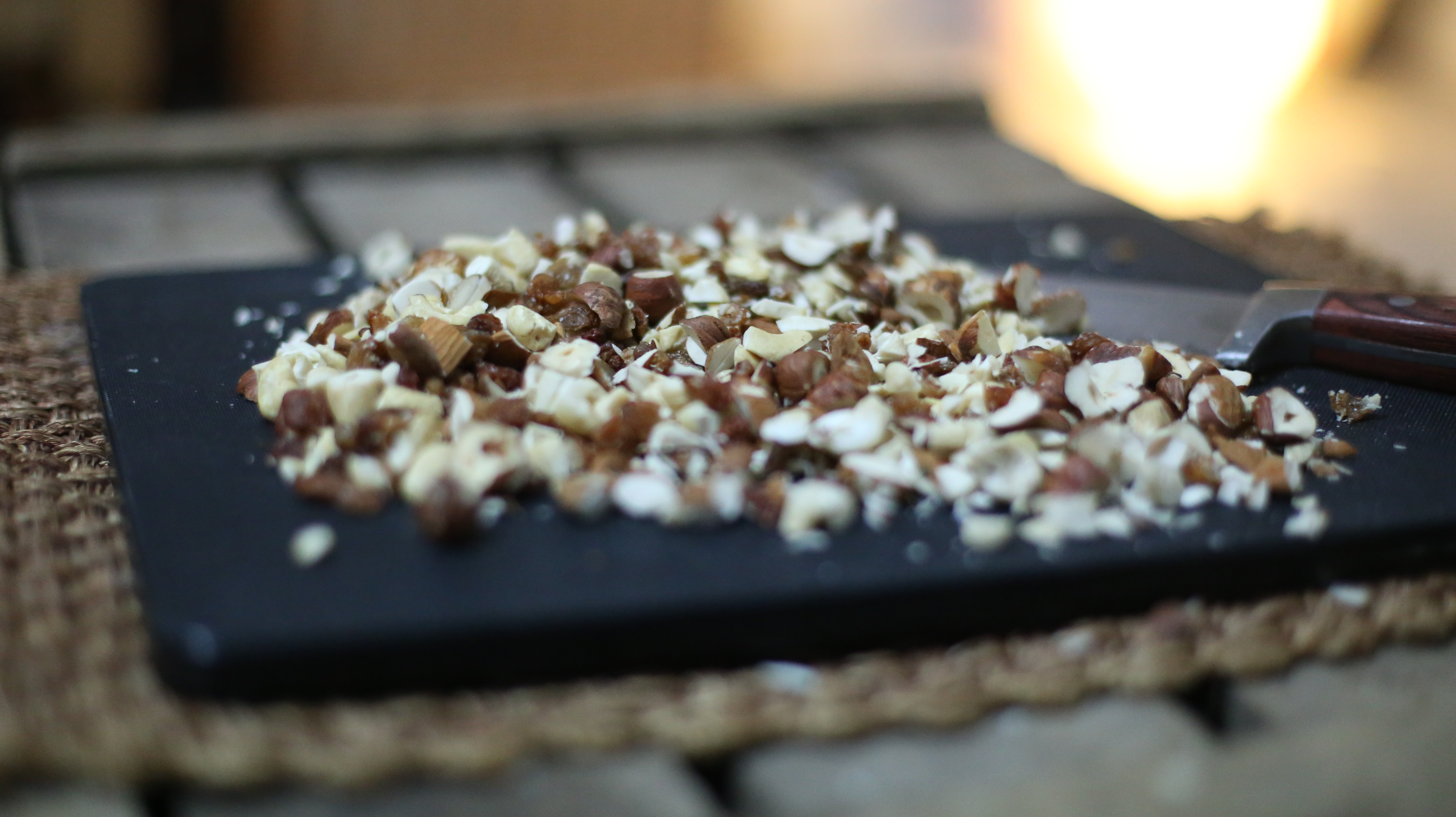 Hachez grossièrement à l’aide d’un gros couteau le mélange de noix.