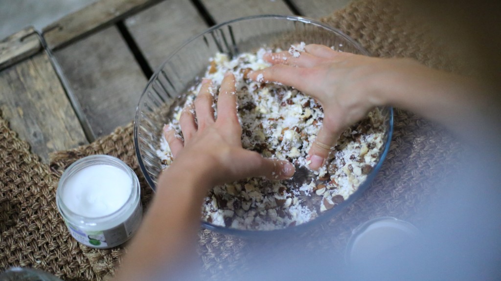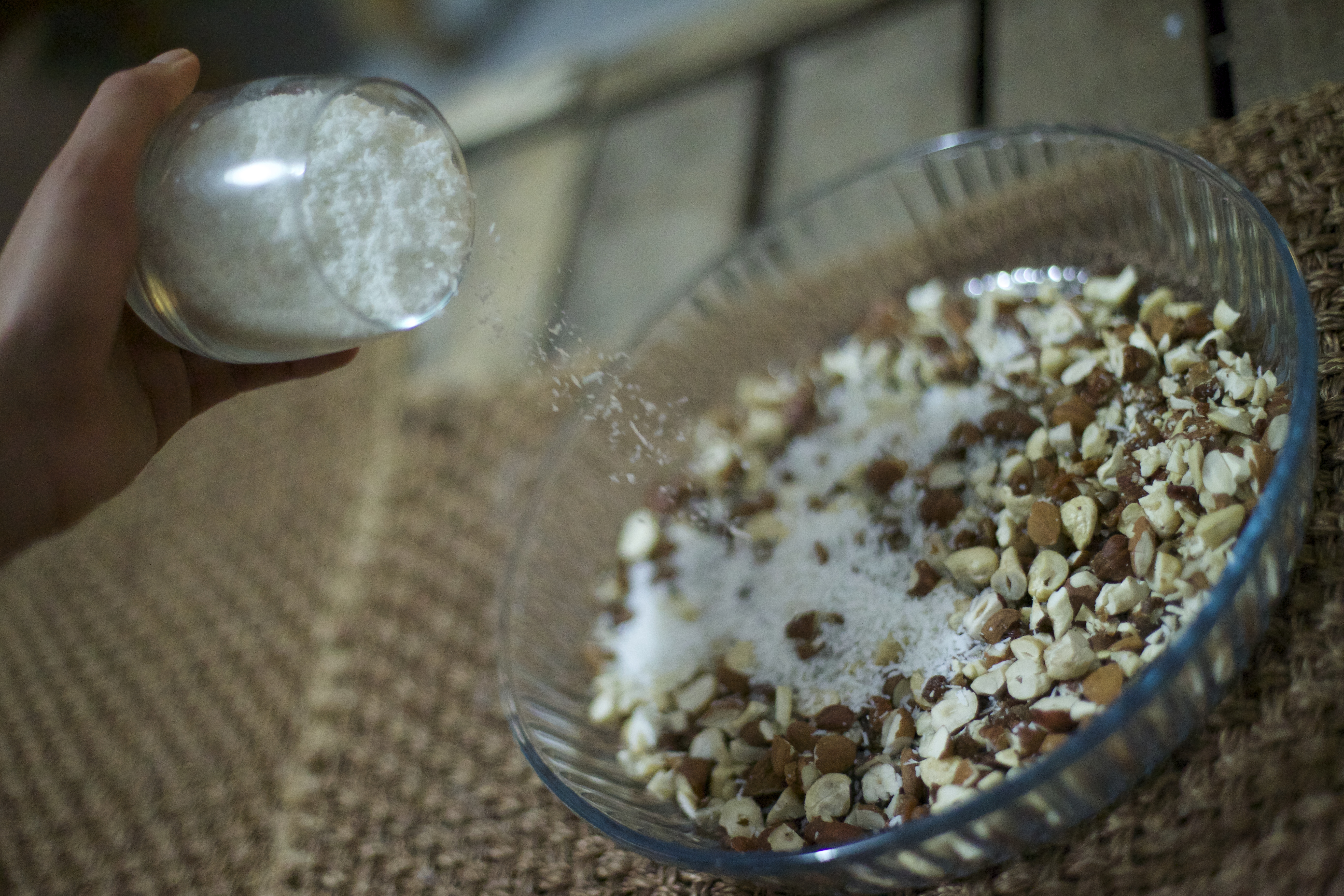 Placez le mélange dans un plat et ajoutez la noix de coco râpée.