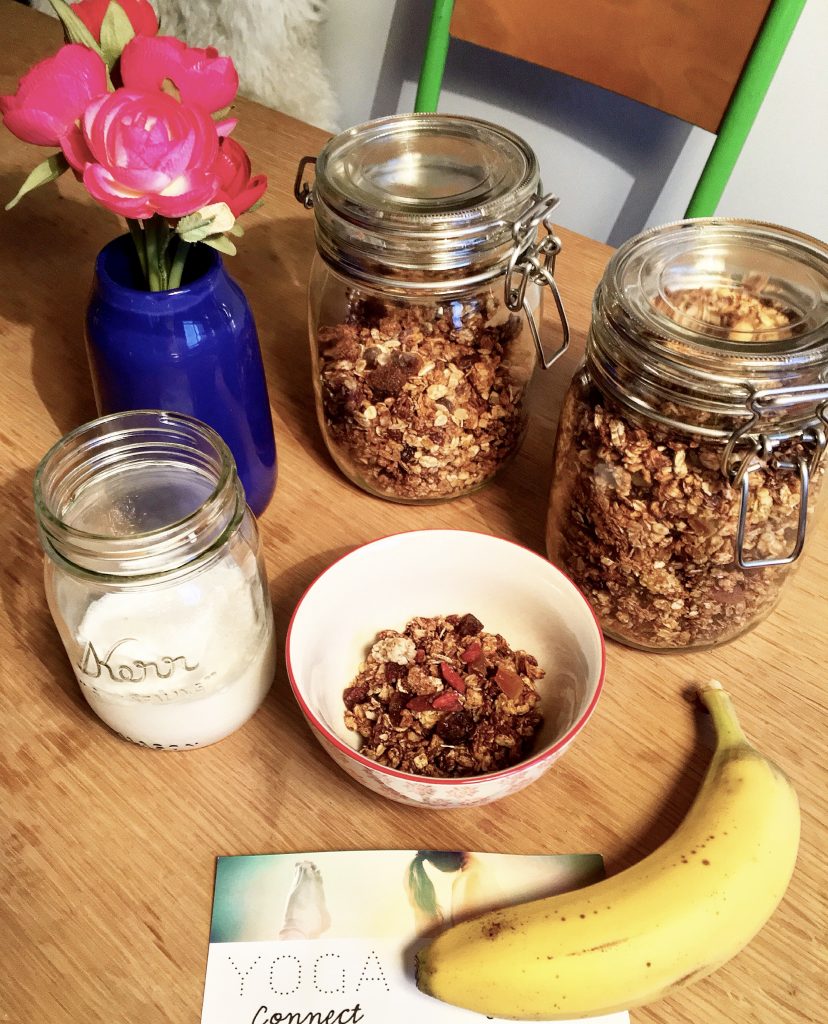 – Du granola maison avec du lait ou un yaourt végétal. Le détail de ma recette de granola hyper easy est sur mon site ici.