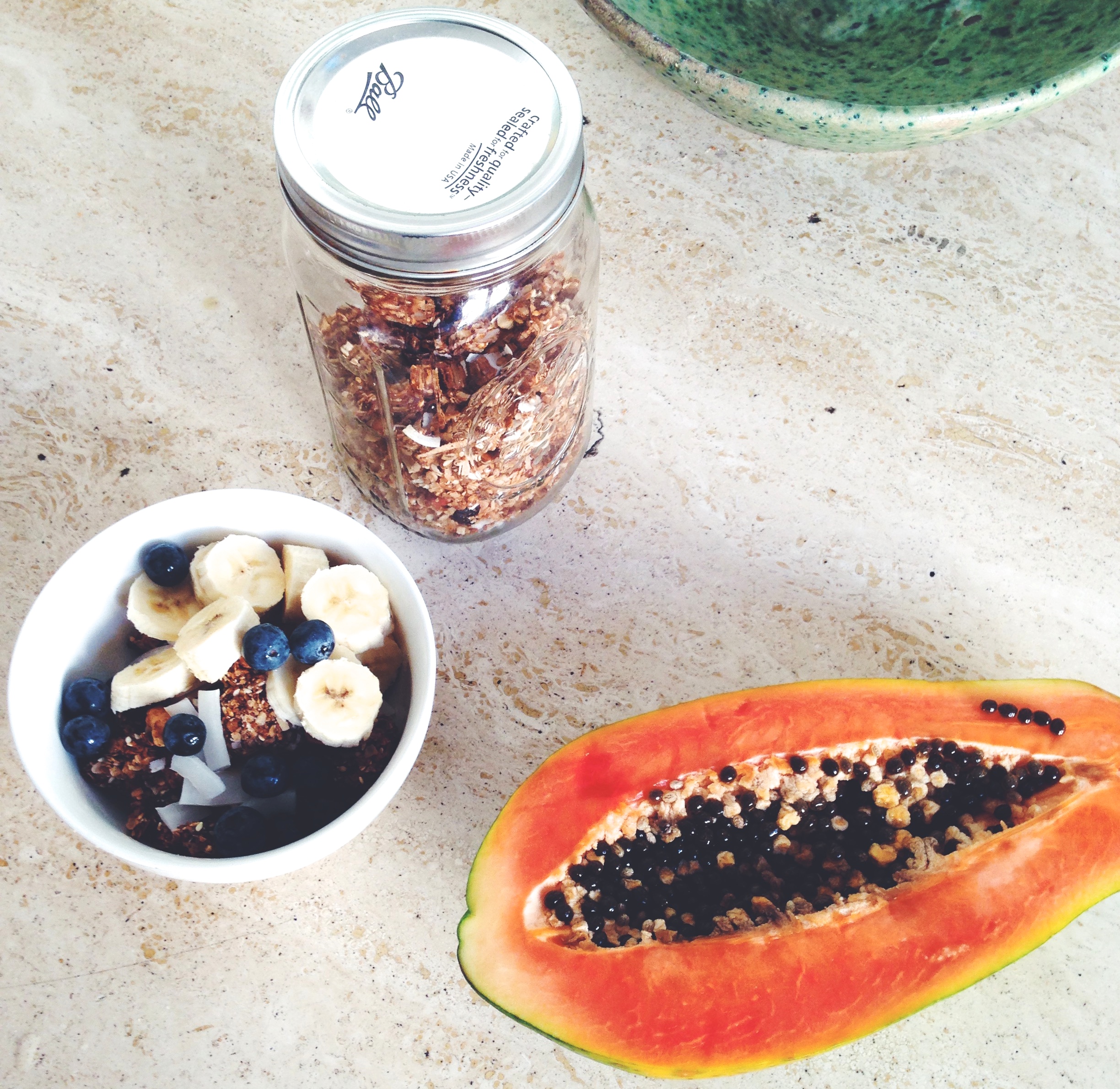 En général je mange du muesli ou granola avec des fruits et un yaourt de brebis ou de soja coco ou lait végétal.