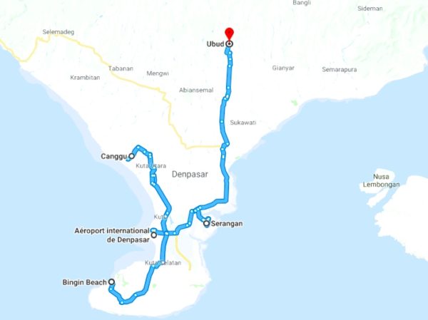 Canggu : au moins 4/5 jours Bukit : 2/3 jours Ubud : 1 journée peut suffire Serangan : 1 après-midi Nusa Lembongan : 4/5 jours.