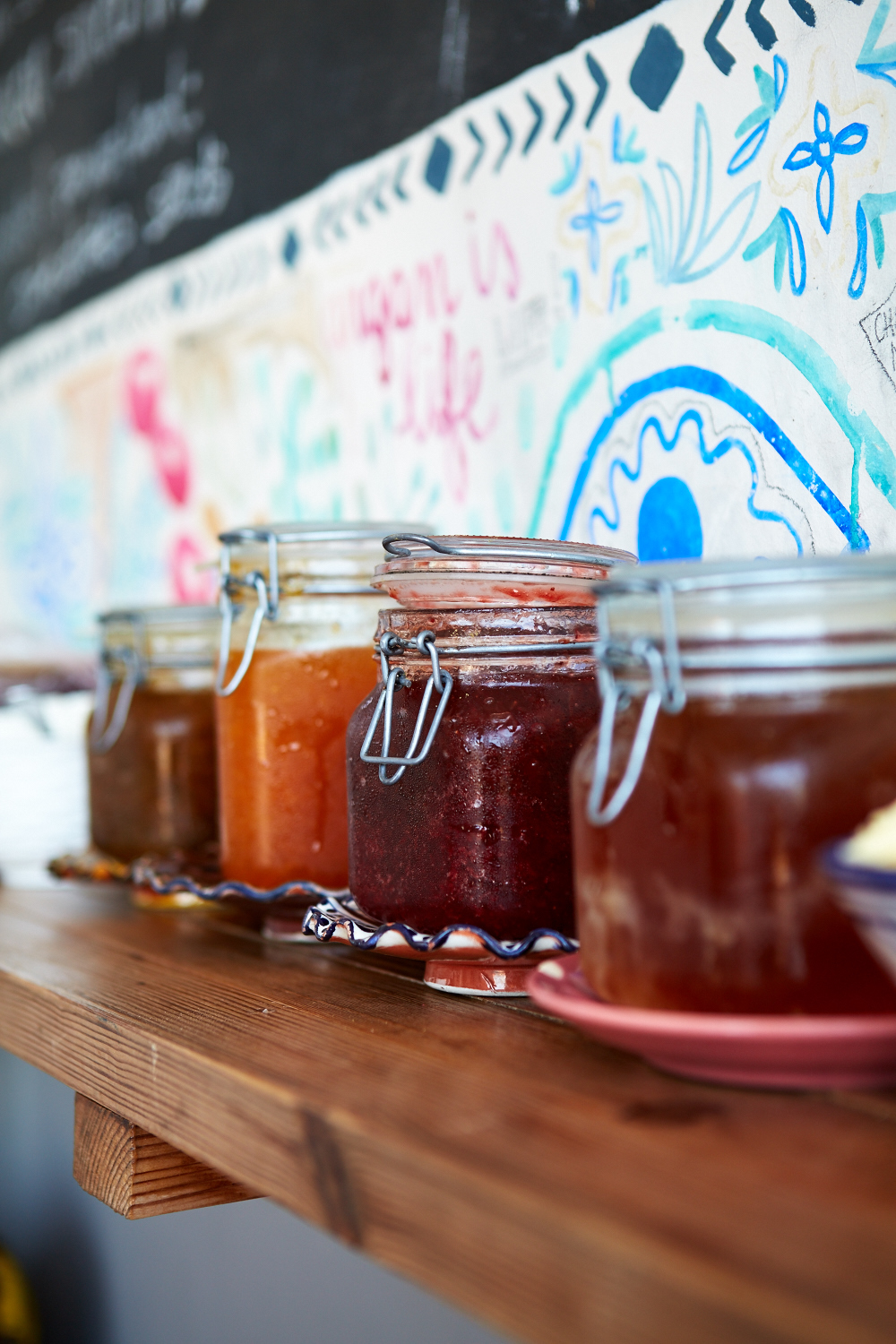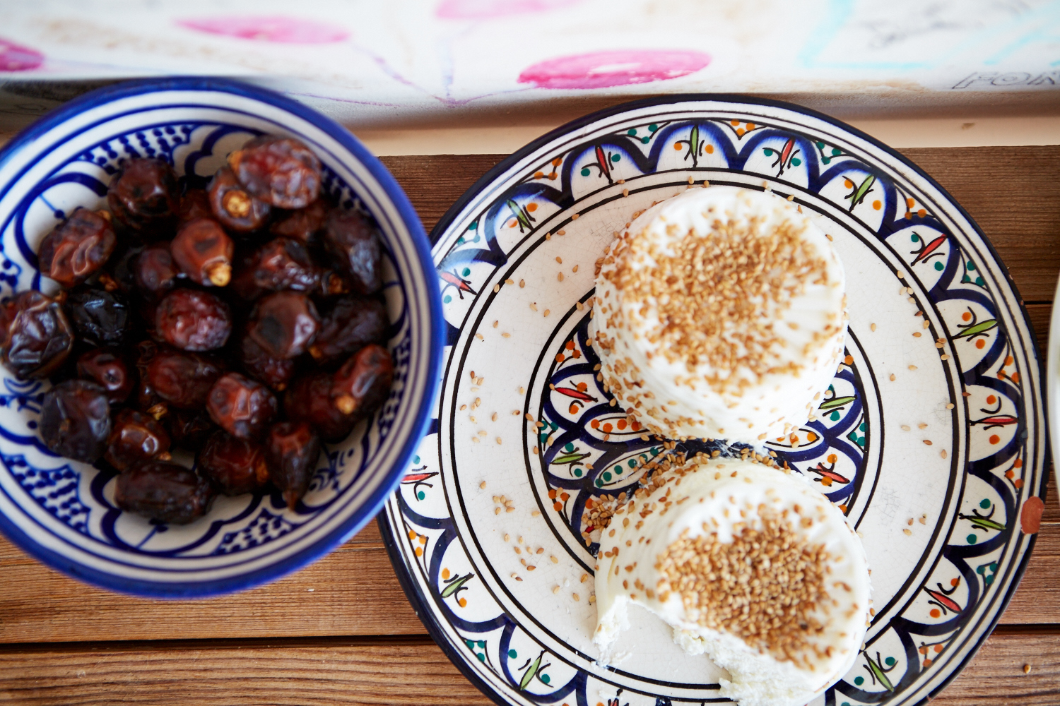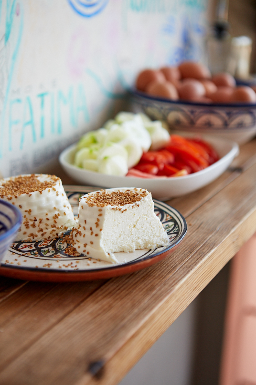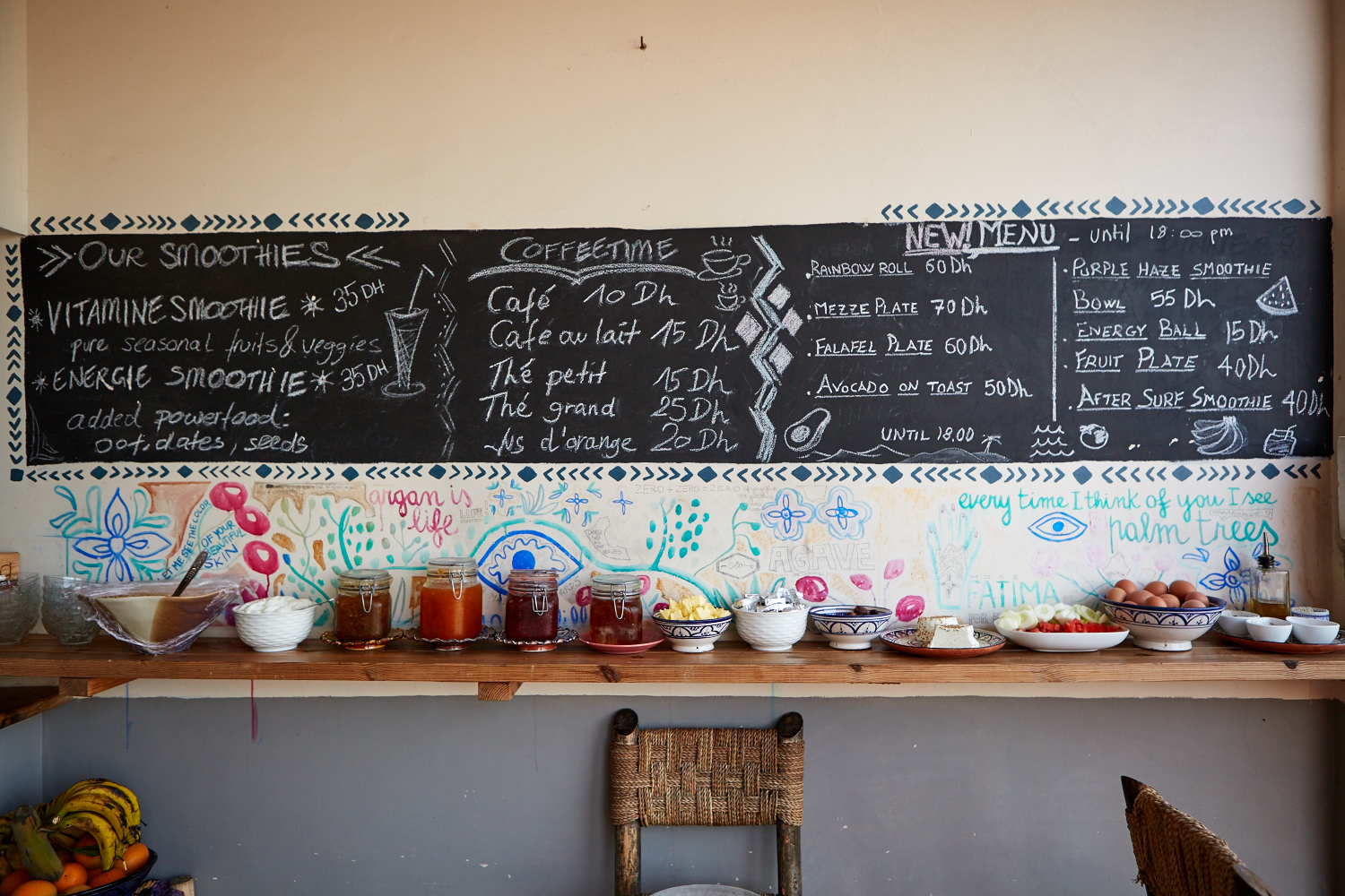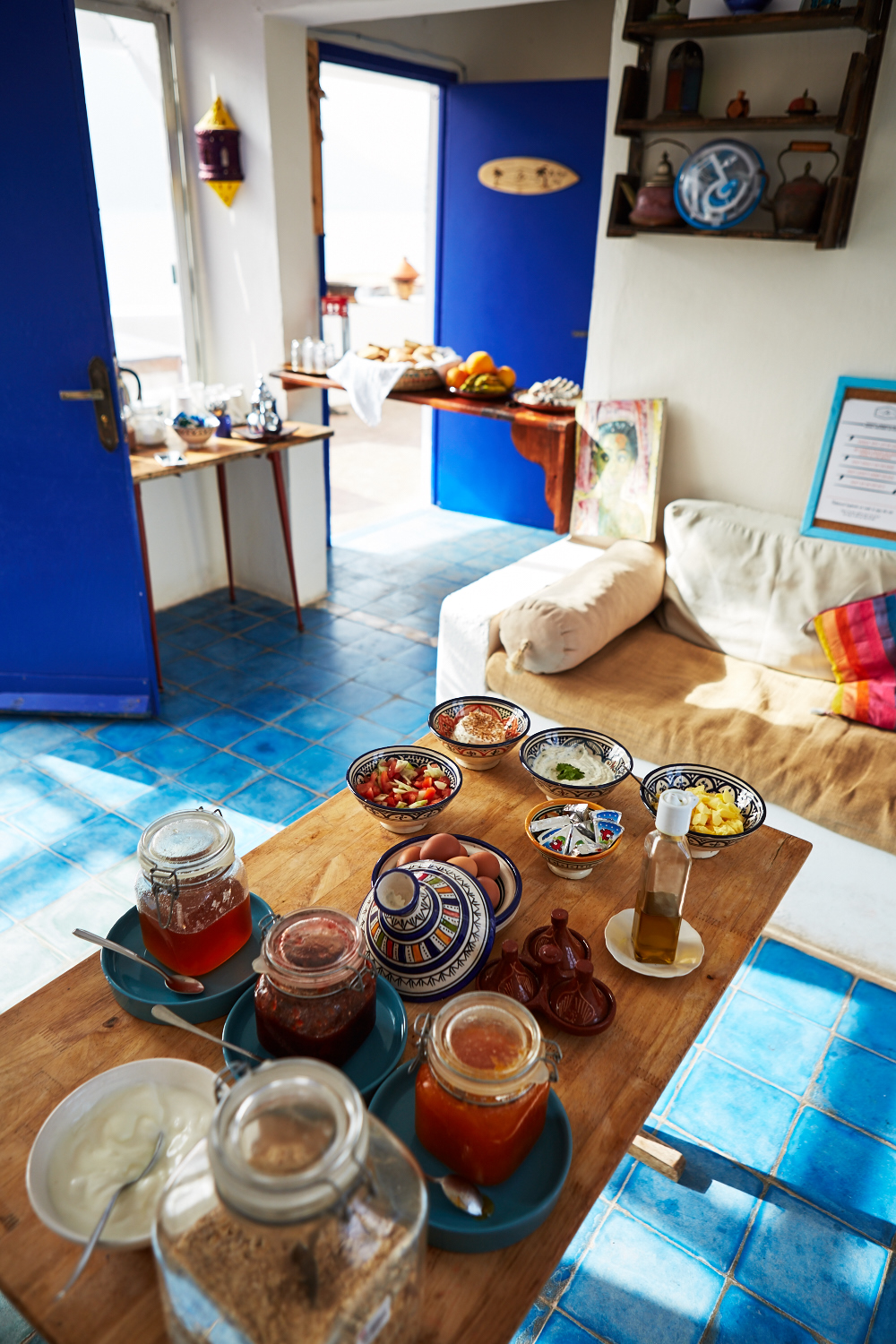 On y trouve des msemens (les crêpes feuilletées marocaines), du fromage Elby, de belles dates, du pain, un large choix de confitures, des oeufs ainsi que des boissons chaudes dont du bon thé maison à la menthe.