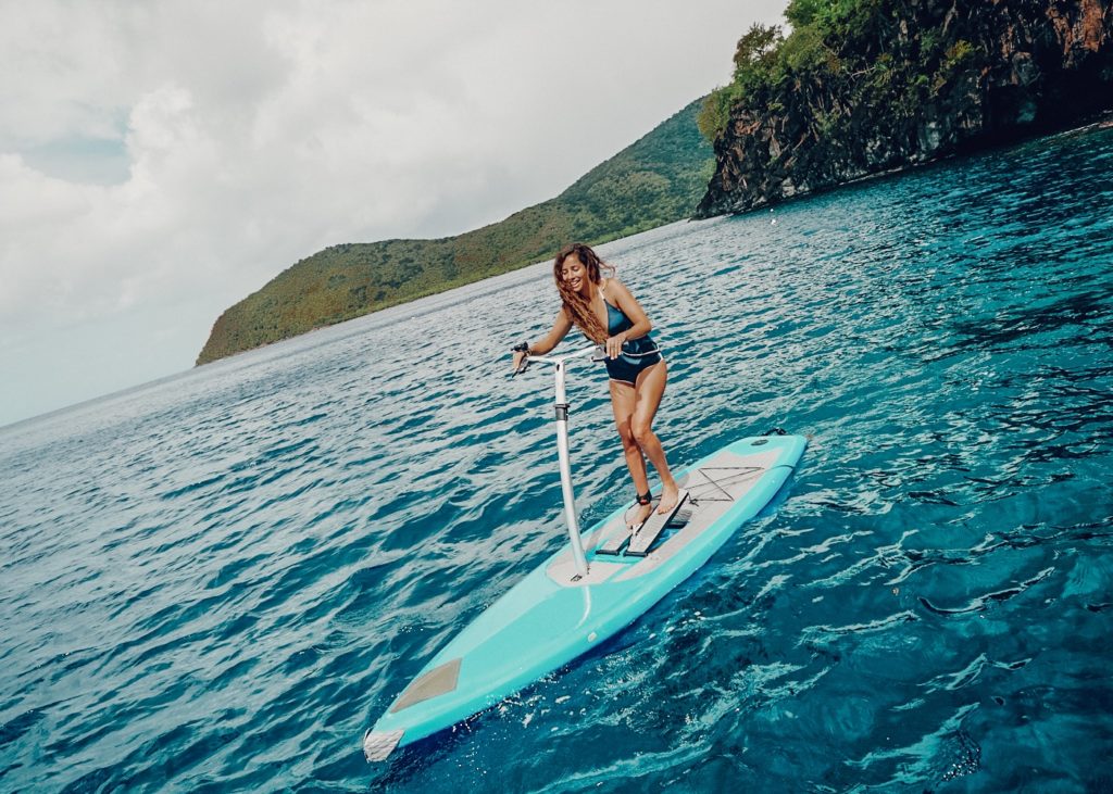 Le rendez-vous est sur la plage des Anses d’Arlet, où l’on retrouve Camina, une jolie martiniquaise très accueillante. Elle nous explique le fonctionnement du step paddle. Pour avancer, on pédale en enfonçant ses pieds comme sur un step. C’est avec la force des jambes que l’on avance. Pour tourner, il y a comme des freins au niveau du guidon qu’il faut actionner pour se diriger.