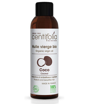 Par contre, il faut juste savoir que l’huile de coco se solidifie à une température inférieure à 25°C. Cela n’altère pas sa qualité mais pour l’utiliser, il faut passer le flacon quelques minutes sous l’eau chaude. Il existe plusieurs marques qui se valent mais pour ma part, j’utilise l’huile bio de Centifolia qui est très bien et a un prix raisonnable.