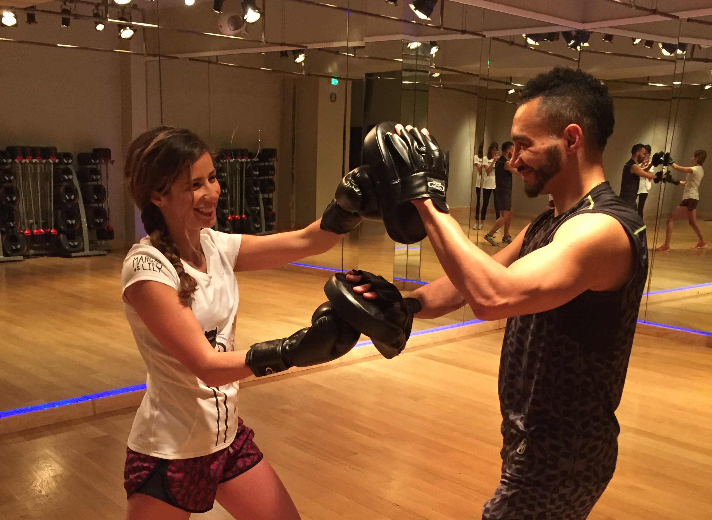 Deuxième partie du cours, on commence les exercices par deux, équipées comme des pros : gants de boxes pour la coachée et pattes d’ours pour la coach qui recevra les coups. Pendant 30 minutes, on enchaîne plusieurs exercices de frappe très cardio qui font travailler les bras, les abdos, les fessiers et les jambes.