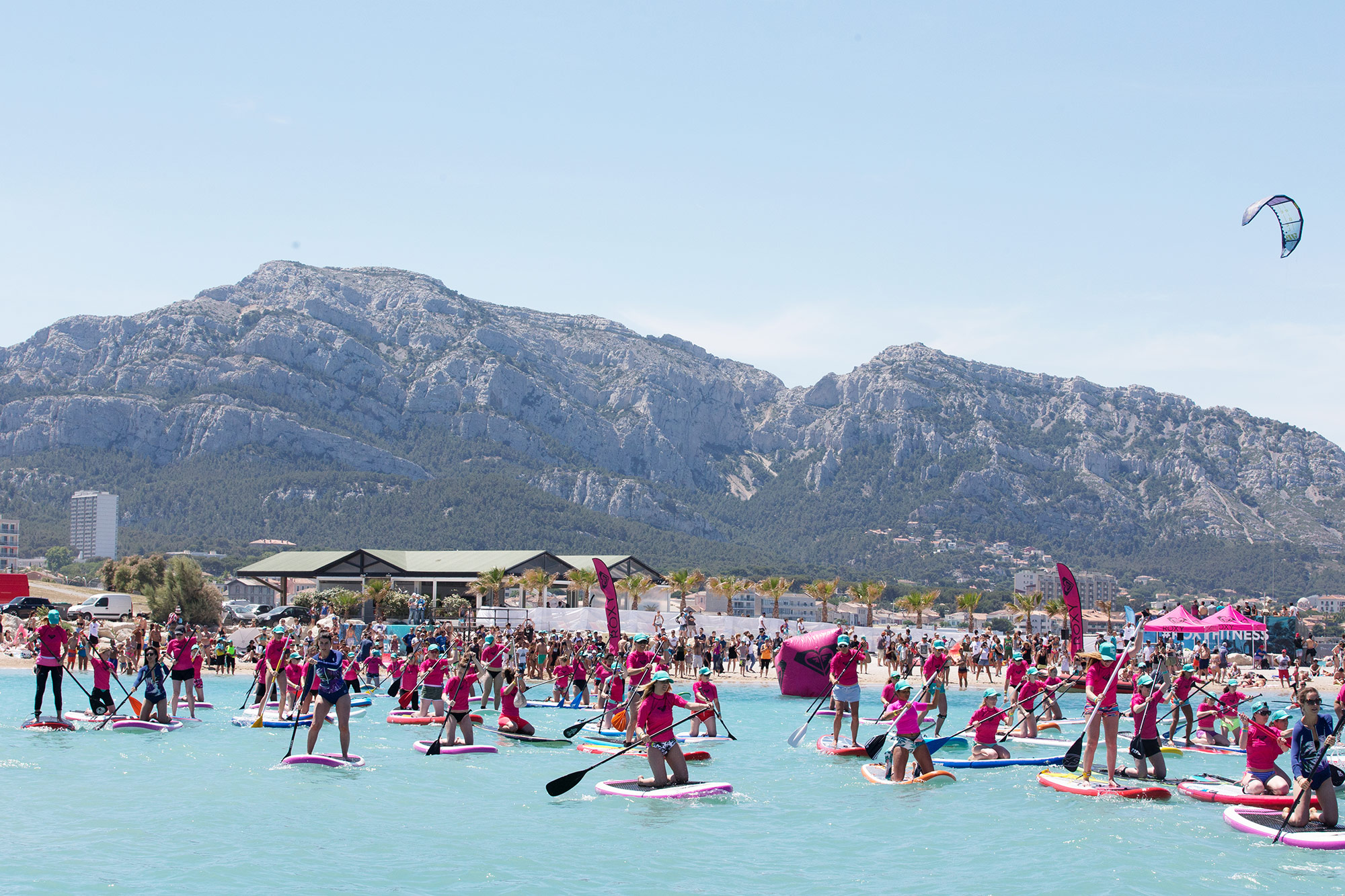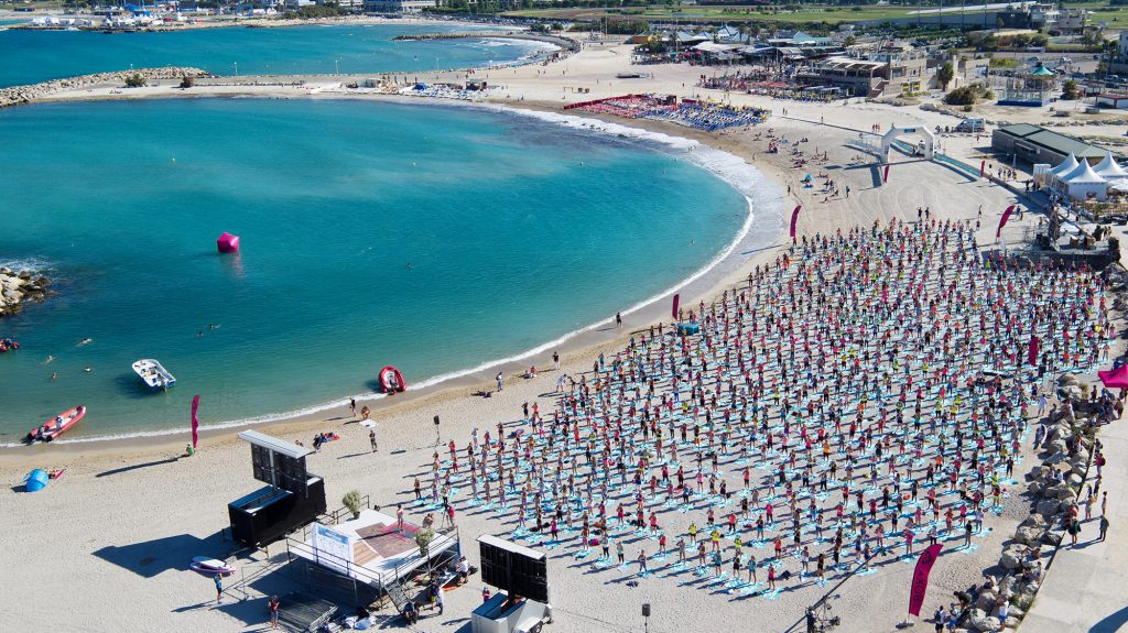 - Une session yoga au bord de l’eau au réveil. Cette session est magique, les pieds dans le sable, sous un soleil matinal, plus de 1000 sportives font une salutation au soleil.