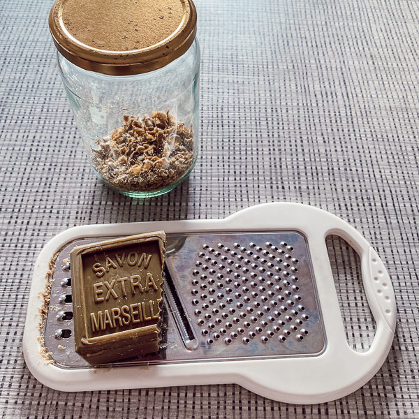 Puis râpez 20g de savon de Marseille et placez vos copeaux dans la casserole en mélangeant. Pesez 20g de savon noir et placez le également dans votre casserole. Ajoutez une belle cuillère de bicarbonate de soute. Terminez en ajoutant 10 gouttes d’huile essentielle de lavande. Mélangez votre mixture jusqu’à ce que tous les copeaux de savon soient dissous.