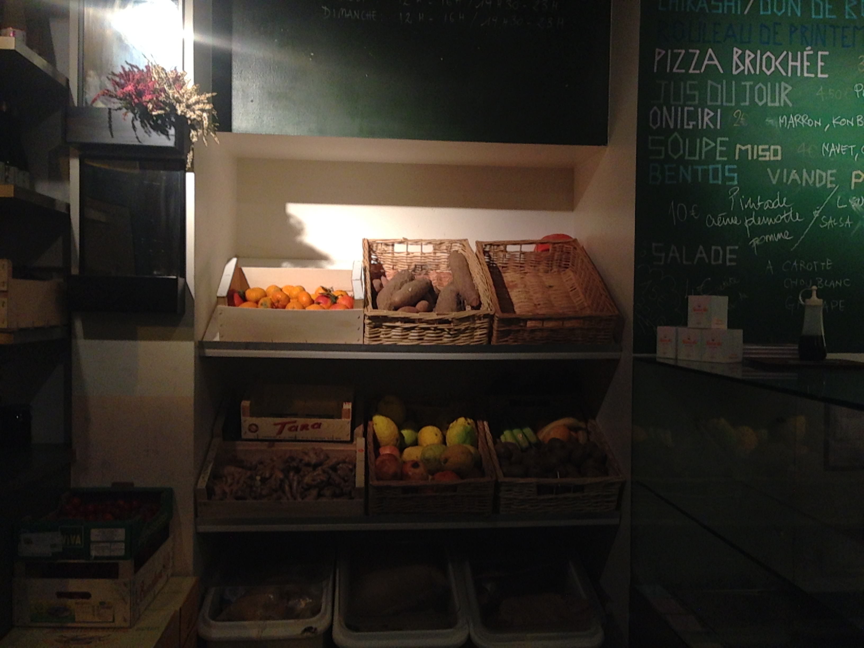 Les menus sont inscrits sur une grande ardoise. En tête d’affiche: jus frais, bentos, et chirachis, et le tout bio!