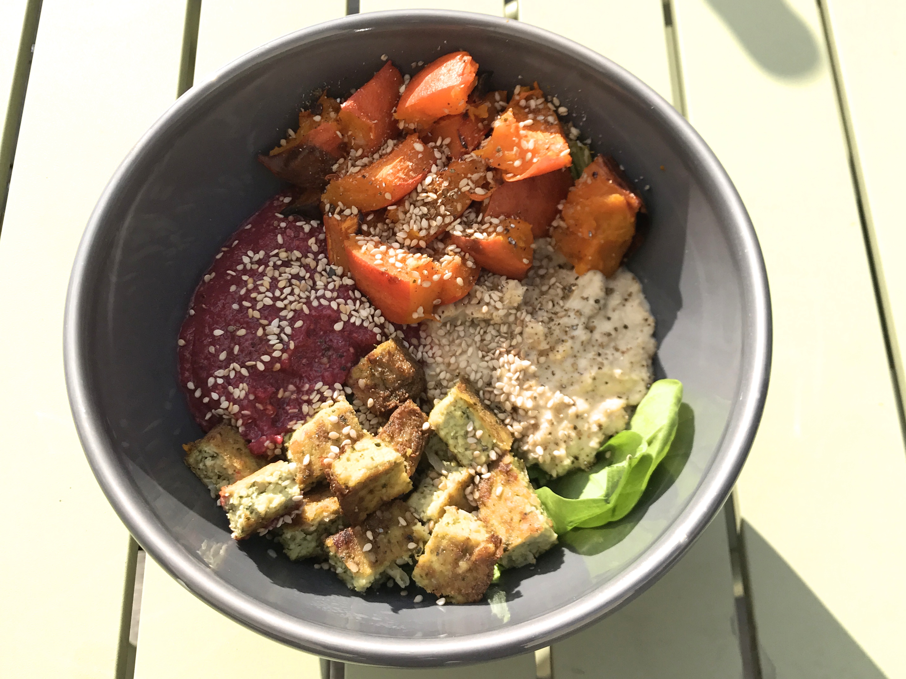 Dressez votre bowl, en plaçant au fond les feuilles d’épinard frais. Puis ajoutez deux cuillères à soupe de houmous ainsi que deux cuillères à soupe de caviar de betteraves. Sortez le tofu et le potimarron du four. Découpez-les en petits cubes et placez les dans le bowl. Saupoudrez un peu de Gomasio pour salez . Et terminez votre dressage en ciselant de la coriandre fraîche au dessus de votre garniture.