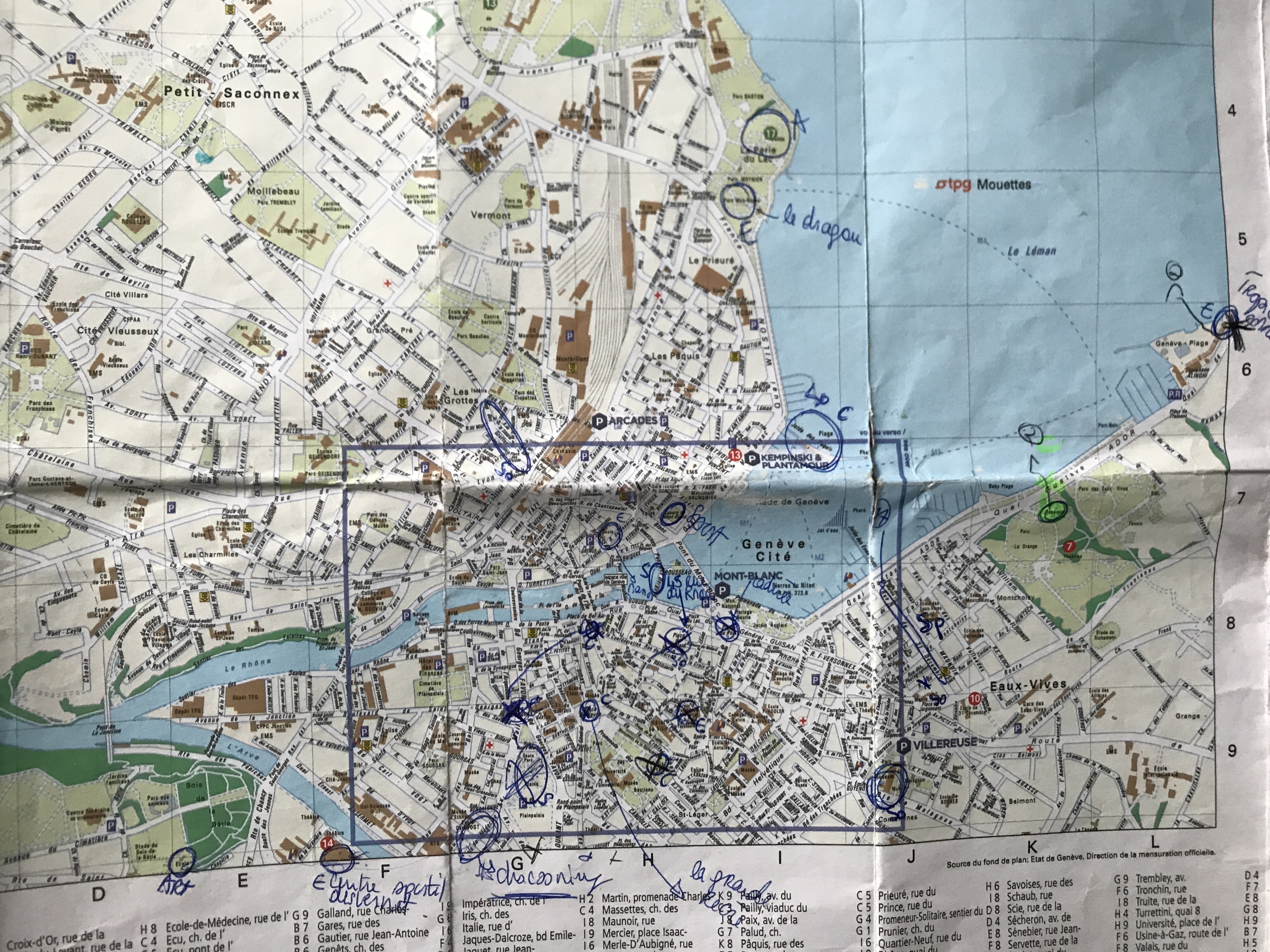 Après une petite heure de réflexion, nous avons résolu les 3/4 des énigmes et tracé notre itinéraire. Il y a des challenges aux 4 coins de la ville. Nous avons donc décidé de dessiner un parcours qui nous permette de toucher un maximum de défis.