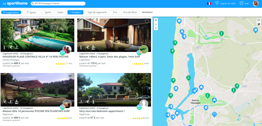 La plateforme est très bien faite et intuitive. Il suffit de rentrer dans les barres de recherche, le sport que l’on recherche, la région, les dates. On lance la requête et le site propose directement les logements disponibles qui correspondent à notre demande.